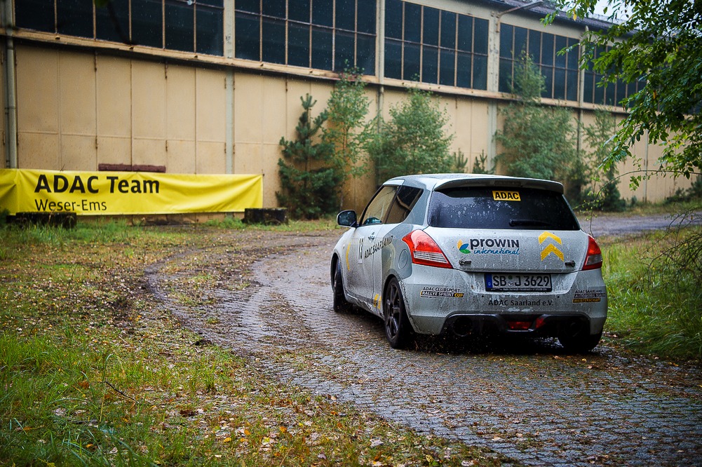 Noch bei trockenen Bedingungen am Freitag konnten wir den uns noch unbekannten Suzuki Swift testen, den wir neben unseren Citroën DS3 R1 am Samstag über das ehemalige IVG-Gelände scheuchen durften. Am Samstag wurde das trockene Wetter durch Dauerregeben ausgetauscht: Seit meiner Sichtung Anfang 2020 war das tatsächlich das erste Event bei nassen Bedingungen! Gepaart mit anspruchsvollen Prüfungen und einem starken Fahrerfeld waren die Zeichen von Anfang an auf Hochspannung gesetzt. Würdige Bedingungen für einen Bundesendlauf. Realistisch gesehen schien für uns aber selbst die Top 5 ein hoch gesteckes Ziel zu sein. Schon am Freitag war mein Motto: Wir erwarten Nichts und hoffen auf Alles.